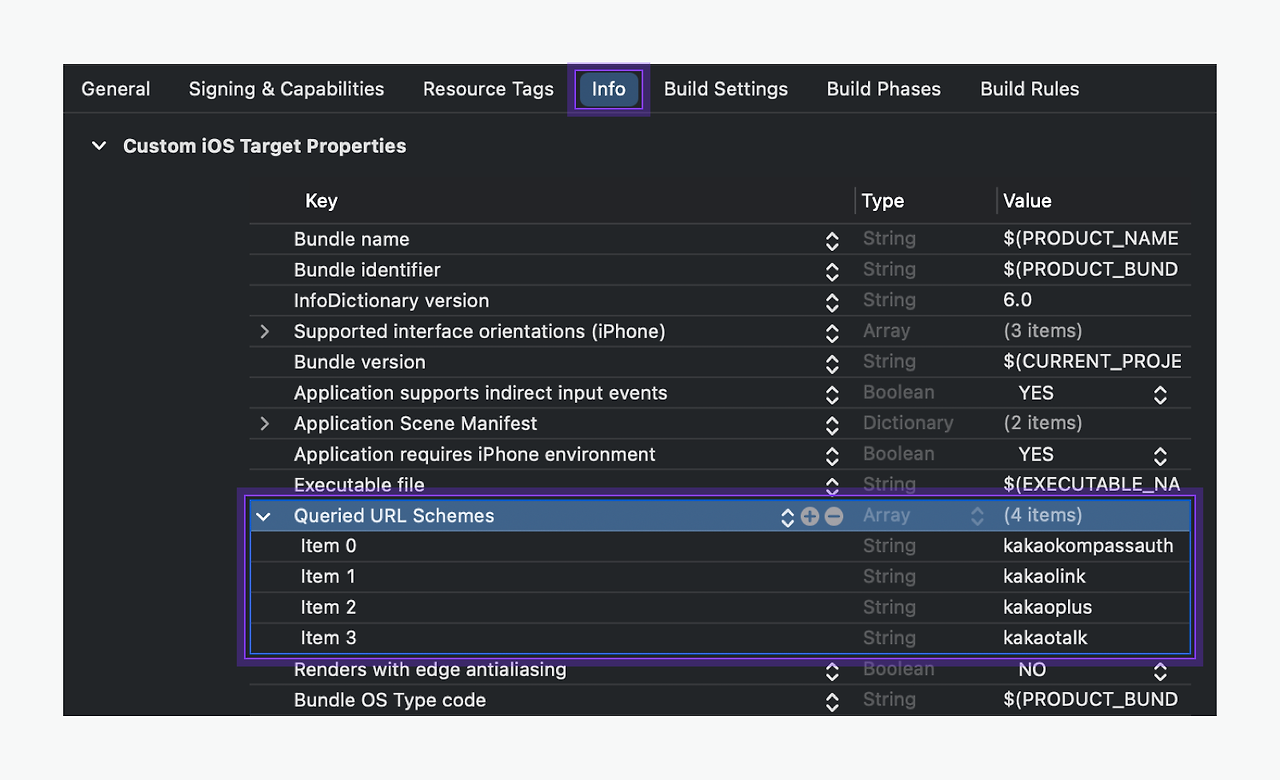 (!) 혹은 아래 사진과 같이 open ios/Runner.xcodeproj 한 뒤, [Info] > [Custom iOS Target Properties]에 Array 타입 키(Key)인 "Queried URL Schemes"을 추가하고, 해당 키의 [Item]에 값으로 kakaokompassauth 추가해줍니다.