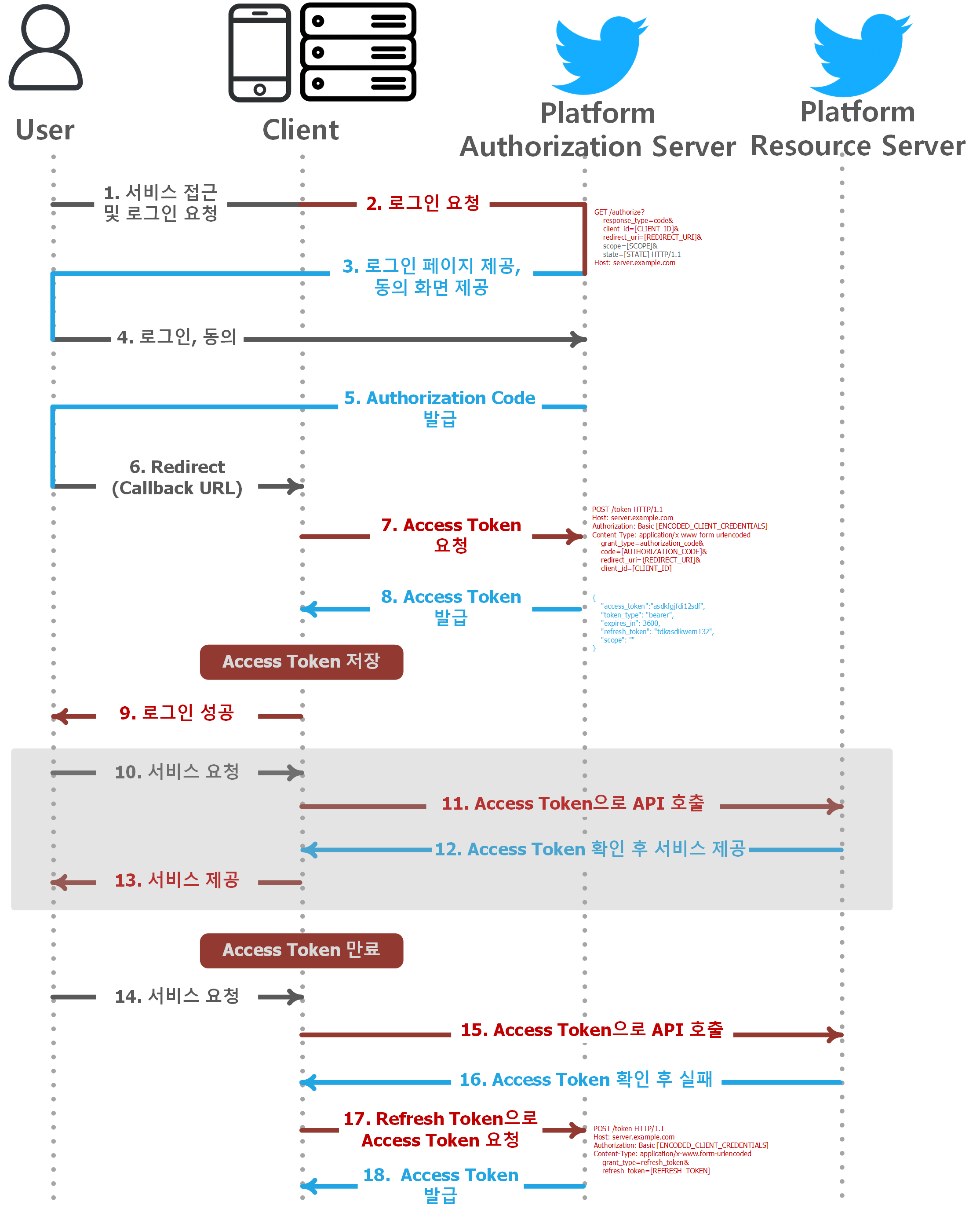 - Step 15~18 : Access Token 만료시 Client가 Refresh Token을 활용해 Authorization Server를 통해 새로운 Access Token을 받습니다.